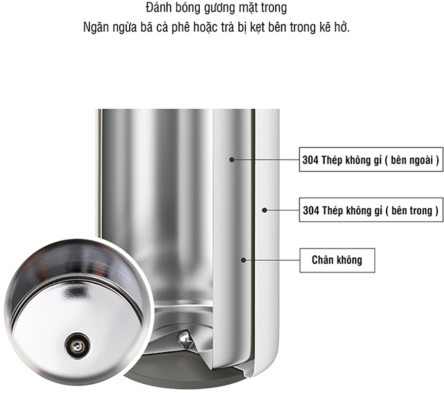 - Thân bình có cấu tạo 4 lớp gồm lớp ngoài cùng và lớp trong cùng làm bằng inox 304 có độ cứng cực tốt, chống trầy xước, chống gỉ và không gây phản ứng hóa học với thực phẩm, 2 lớp ở giữa là lớp chân không và lớp mạ đồng đóng vai trò tăng cường khả năng giữ nhiệt, hạn chế nhiệt bị thất thoát ra ngoài.
