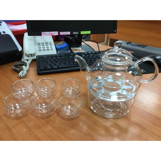 Bộ Ấm trà thủy tinh chịu nhiệt dung tích 600ml kèm 6 cốc sử dụng cho tiệc trà, có thể đun trên đế nến, bếp hồng ngoại.