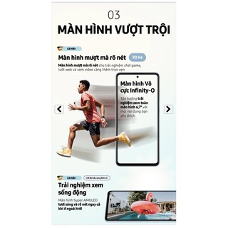 Mãn nhãn với những hình ảnh chi tiết, rực rỡ trên màn hình Super AMOLED chuẩn FHD+ với độ sáng lên đến 800 nit1, luôn sắc nét kể cả khi sử dụng dưới trời nắng gắt. Công nghệ Eye Comfort Shield2 giảm thiểu ánh sáng xanh gây hại cho mắt, trong khi đó công nghệ Real Smooth mang đến trải nghiệm mượt mà tối ưu, bất kể bạn chơi game hay lướt web. Thoả sức trải nghiệm mọi điều bạn muốn, trên màn hình tràn viền vô cực Infinity-O 6.7 inch.