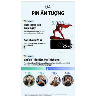 Với dung lượng pin 5.000mAh (tiêu chuẩn)², bạn có nhiều thời gian hơn để làm những điều mình thích - truyền phát trực tiếp, chia sẻ, chiến game và hơn thế nữa. Tính năng quản lý pin sử dụng AI để xác định thói quen sử dụng và điều chỉnh năng lượng phù hợp. Công nghệ Sạc Nhanh Siêu Tốc lên đến 25W nhanh chóng sạc đầy nội dung cho bạn trải nghiệm xuyên suốt ngày dài.