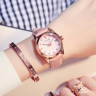 Đồng hồ nữ đeo tay dây da Guou viền mạ vàng chính hãng chống nước tuyệt đối 8076