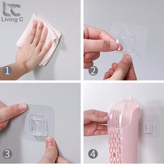 - Dán miếng dán giữ kệ, lấy tay miết mạnh để miếng dán dính chặt vào tường, lắp giá lên.
