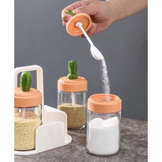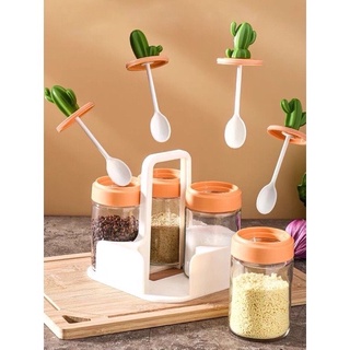 Set 4 Lọ đựng gia vị thủy tinh xương rồng cao cấp, hũ bột canh kèm muỗng thìa đẹp