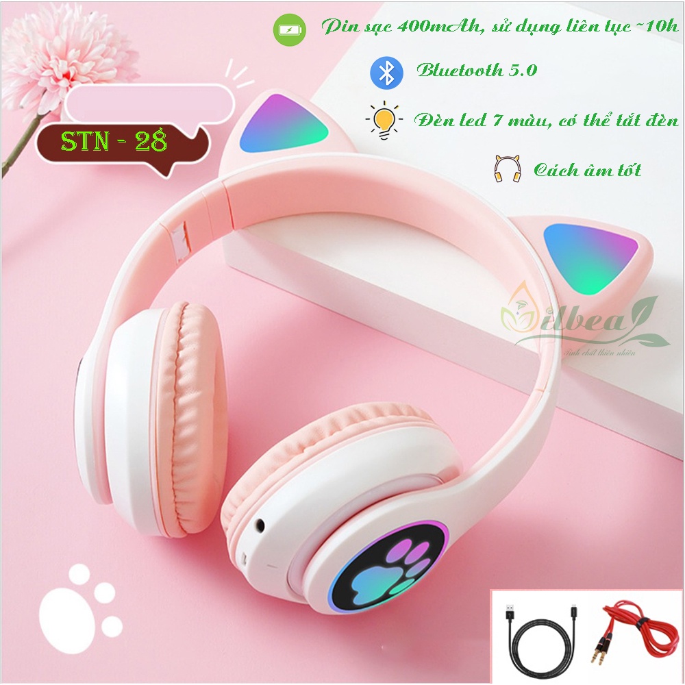 Tai Nghe Mèo Bluetooth Headphone Tai Mèo Chụp Tai Không Dây Có Mic Chống Ồn Âm Bass Pin Sạc 400mAh