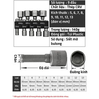 Bộ 9 Khẩu Tuýp Vặn Ốc Lục Giác VITO Gắn Máy Khoan 9 Đầu Vít Bắn Tôn