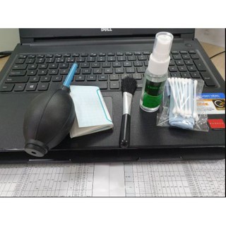 - Bộ vệ sinh laptop gồm 6 món tiện dụng: dụng cụ thổi bụi, chổi quét, nước lau màn hình, khăn lau, giấy thấm màn hình, tâm bông.