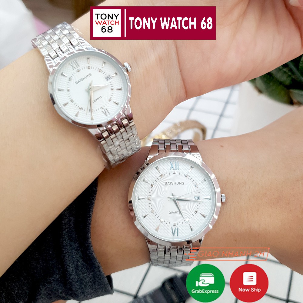 Đồng hồ cặp đôi nam nữ Baishuns mặt tròn trắng dây kim loại bạch kim chính hãng Tony Watch 68