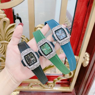 Đồng Hồ Nữ Đeo Tay Hublot, Đồng Hồ Thời Trang Nữ Đính Đá Dây Cao Su Silicon Mặt Chữ Nhật Viền Kim Loại