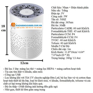 Thông số kỹ thuật máy lọc không khí mini để bàn lọc bụi mịn có led UV khử khuẩn khử mùi trong phòng Air Purifier